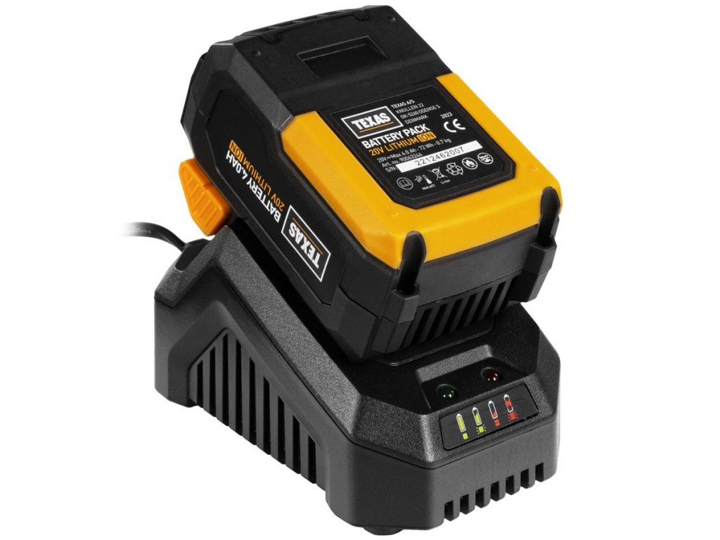 Do stroja sa odporúča použiť 20V/4,0 Ah batériu. Dodávaná rýchlonabíjačka nabije 4,0 Ah batériu za 120 minút. Pracovný čas batérie je až 23 minút.