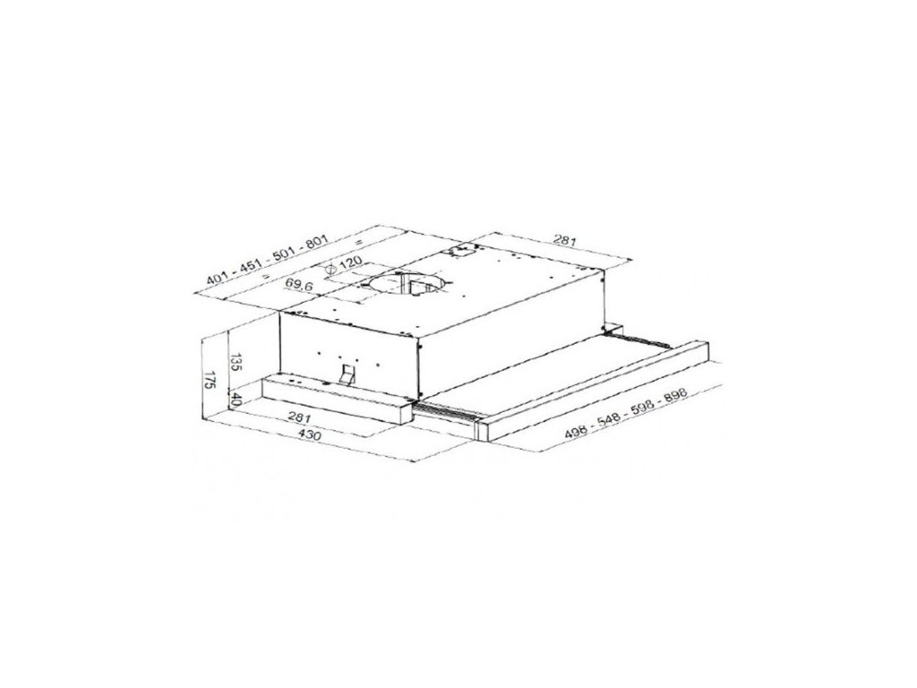 Typ Teleskopický odsávač TECHNICKÉ ŠPECIFIKÁCIE Typ tukového filtru Multilayer cassette Motor - 1 Typ ovládania - mechanické Umiestnenie motora - v hornej časti Osvetlenie Halogen Farba biela Frekvencia (Hz) 50 Napätie (V) 230-240 Celkový výkon lamp (W) 56 Ročná spotreba energie, (kWh / rok) 118,4 Energetická trieda E ROZMERY - viď obrázok Priemer výstupu vzduchu (mm) 120 Čistá hmotnost (kg) 8,1 Hrubá hmotnost (kg) 9,1