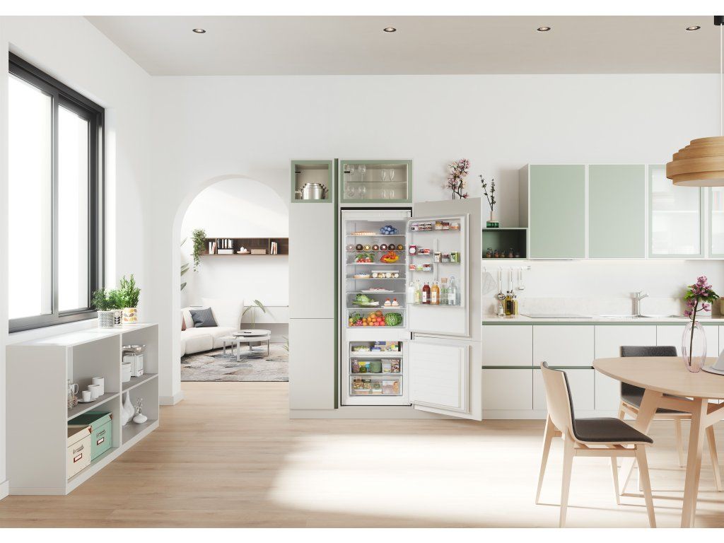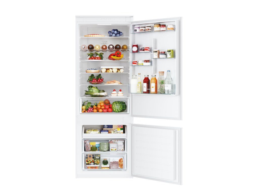 Trieda energetickej účinnosti: E Celkový čistý objem (l): 364 Čistý objem chladničky/mrazničky (l): 281/83 Spotreba energie za deň (kWh/24 hod): 0,828 Ročná spotreba energie (kWh/rok): 239 Mraziaci výkon (kg/24 hod): 4 Doba skladovania pri výpadku prúdu (hod): 22 Úroveň emisií hluku šíreného vzduchom (dB(A) re 1 pW): 33 Emisná trieda hluku šíreného vzduchom: B Klimatická trieda ST Hviezdičkové označenie * * * * Vlastnosti Pripojenie cez Wi-Fi a konektivita s aplikáciou hOn Elektronické ovládanie – dotykové ovládanie ovládacieho panelu Multiflow Circle+ - konštantná a homogénna teplota a vlhkosť na každej polici a rohu vo vnútri chladničky. Bočné prúdenie vzduchu vychádzajúce z postranných vývodov udrží potraviny dlhšie čerstvé. Total No Frost - beznámrazová technológia Super Cooling – rýchle chladenie Super Freezing - rýchle zmrazenie Zvukový signál pri nedovretých dverách Prázdninový režim ECO režim Chladnička 5 úrovní chladenia 4 + 1 sklenené police, chrómovaná polica na víno 2 + 3 priehradky vo dverách chladničky 1x Univerzálny box (Crisper) bez regulácie vlhkosti vzduchu Držiak na vajíčka Mraznička 3 úrovne mrazenia 2 plastové zásuvky (transparentné) + 1 zásuvka bez veka Forma na ľad Konštrukcia Osvetlenie LED Reverzibilné dvierka – výmenné pánty dverí Dvere s nábehom – kĺzavé (sliding) pánty Invertorový kompresor