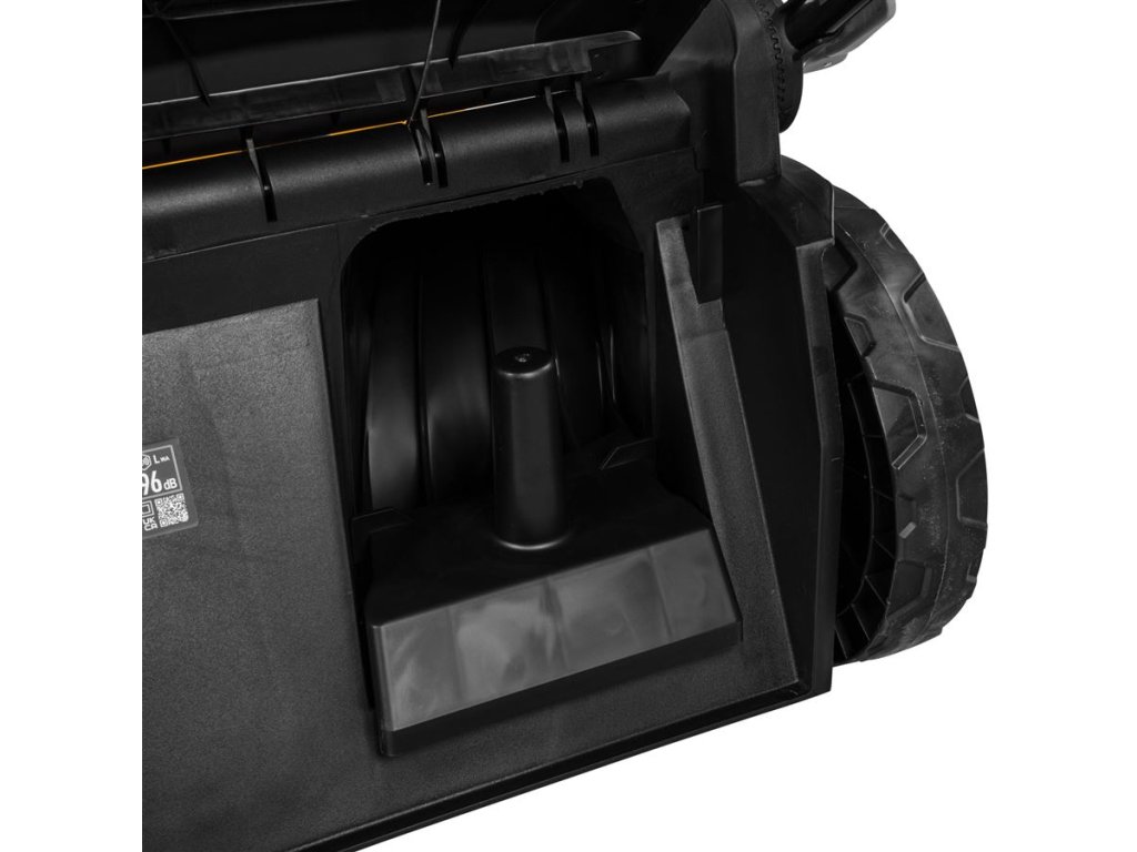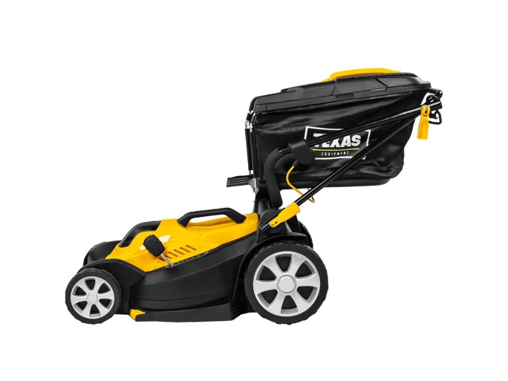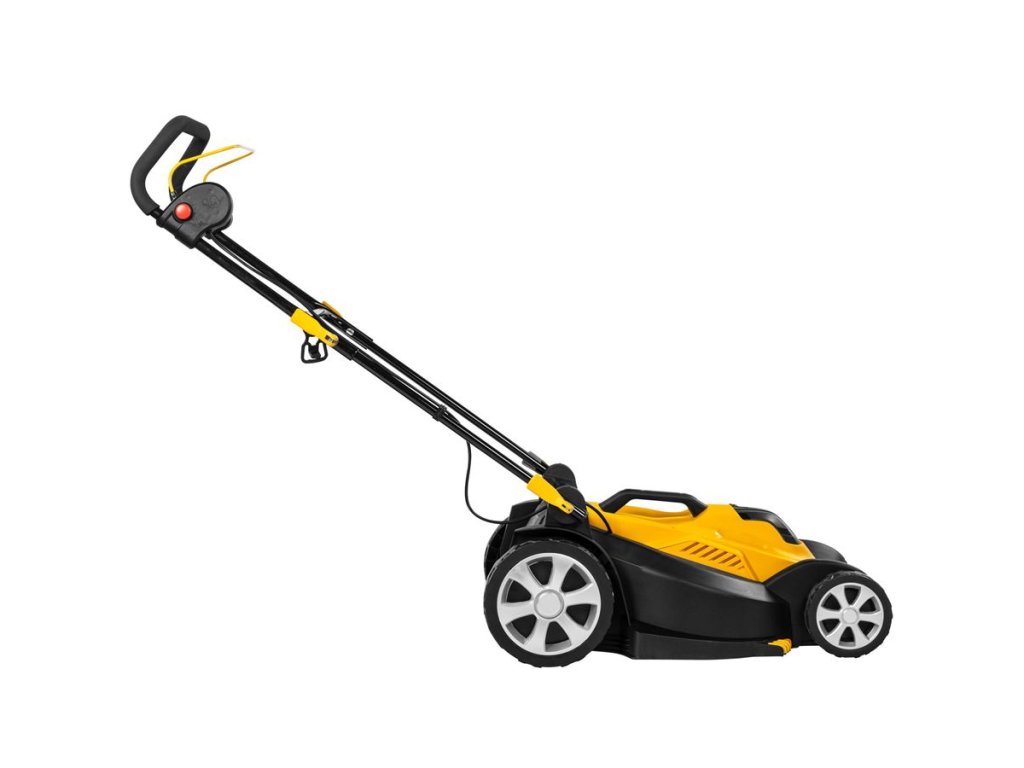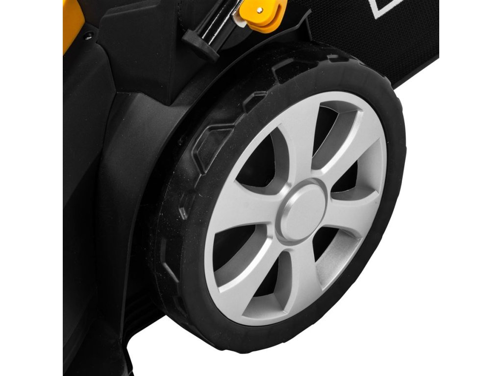 Táto elektrická kosačka je vybavená 230 V motorom s výkonom 1800 W, ktorý sa spúšťa jednoducho stlačením tlačidla. V porovnaní s benzínovými kosačkami ponúka nižšiu hmotnosť, tichšiu prevádzku, jednoduchšiu manipuláciu a menej údržby. Plastové šasi zároveň pomáha udržať celkovú hmotnosť kosačky len na 16,5 kg. Kosačka má väčšie zadné kolesá ako predné, čo zabezpečuje lepšiu stabilitu a jednoduchšie prekonávanie nerovností v teréne.