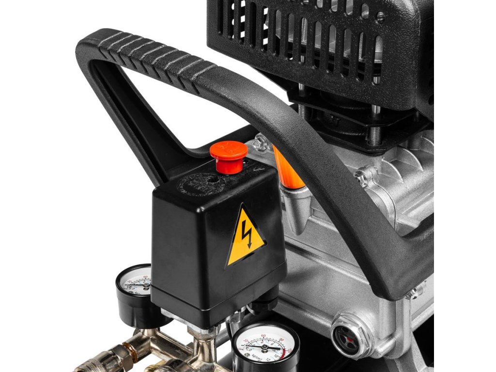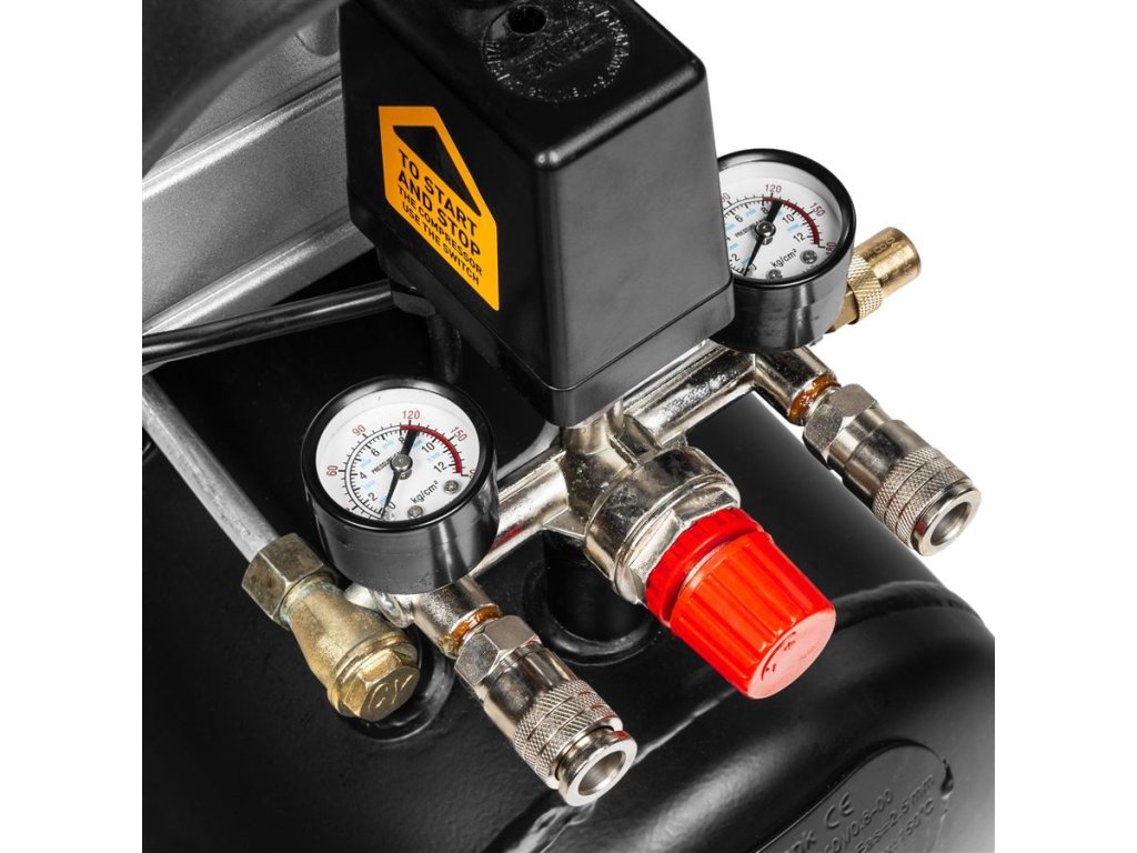 Kompresor má 24 litrovú nádrž, je vybavený 2 rýchlospojkami pre jednoduchú montáž náradia a 2 manometrami na odčítanie tlaku. K dispozícii je tiež redukčný ventil na nastavenie prevádzkového tlaku, takže tlak vzduchu možno regulovať a prispôsobiť úlohe.